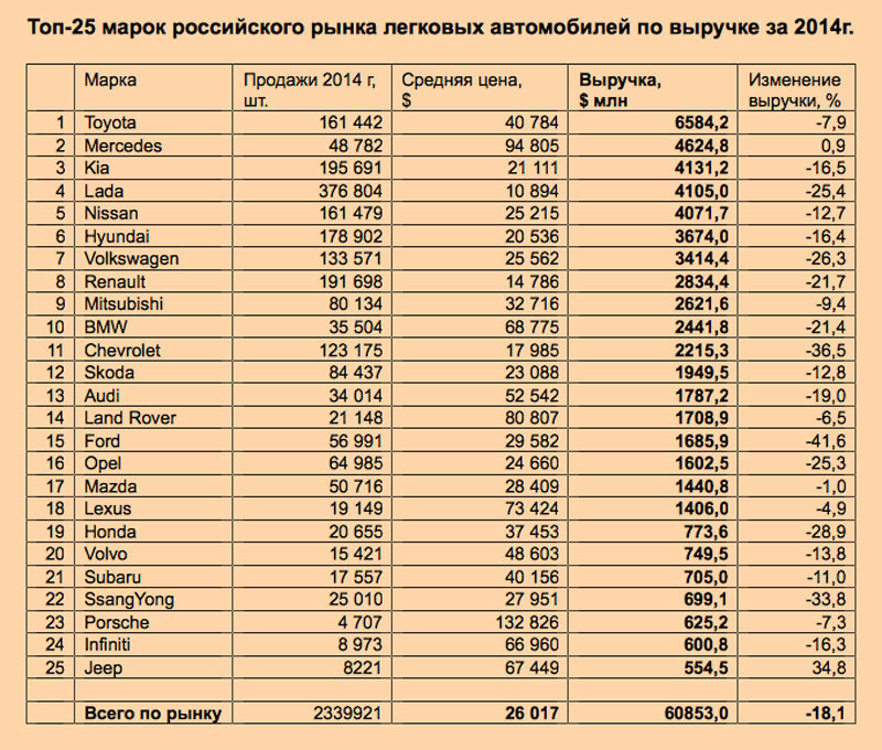 Топ-25 марок российского рынка легковых автомобилей по выручке за 2014 г. Источник: АА "Автостат"