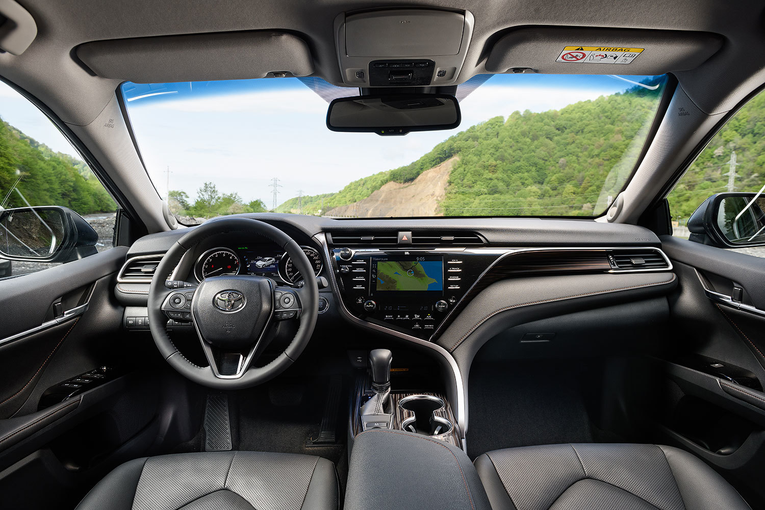 Асимметричная передняя панель Camry сориентирована на водителя и сделана в стиле последних новинок Toyota. Мультимедийная система Touch 2, к счастью, сохранила несколько кнопок, на которые выведены основные функции, на экран теперь выводится круговой обзор с камер вокруг машины. Эргономика и посадка за рулем отличные: всё под рукой, сидеть удобно, кресло регулируется сервоприводами с памятью настроек (в дорогих комплектациях, как V6), оснащено подогревом и вентиляцией, которая всасывает воздух с поверхности внутрь сиденья, а не выталкивает наружу. Увеличен диапазон регулировок руля (вылет теперь регулируется на 60 мм), сам руль стал на сантиметр меньше диаметром (370 мм).