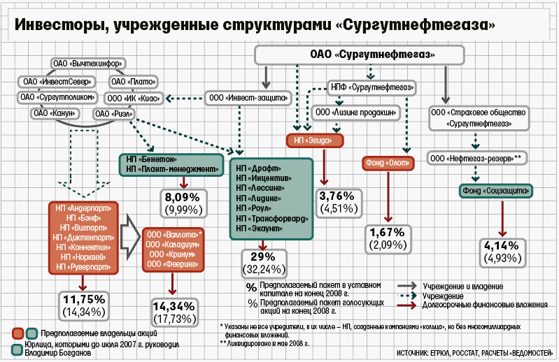 Руководители этих организаций – сотрудники «Сургутнефтегаза». До 2007 г. десятью из них (c предполагаемым пакетом в 42%) руководил лично Богданов, остальными – топ-менеджеры компании. В 2007–2008 гг. их сменили рядовые сотрудники «Сургута».