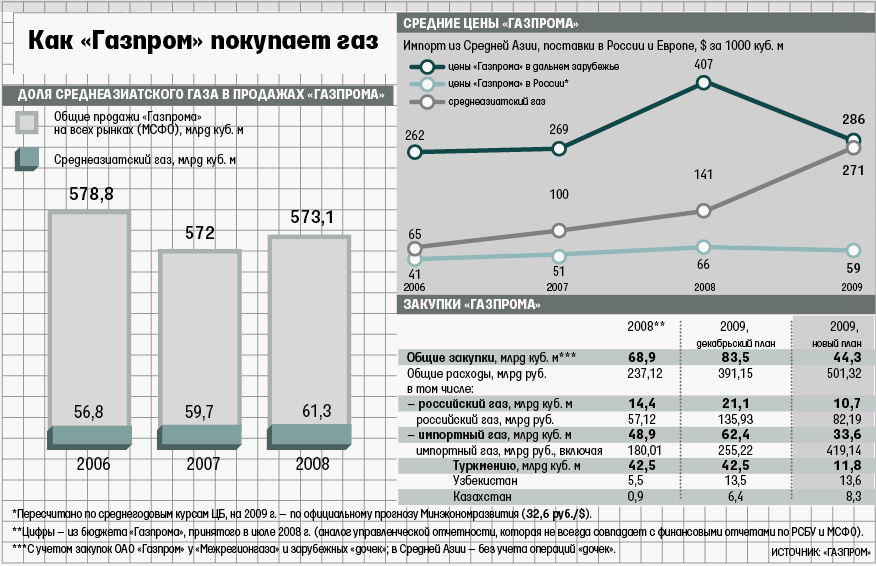 До кризиса «Газпром» покупал чужой газ, поскольку его продажи превышали добычу (в 2008 г. – 572 млрд куб. м против 549,7 млрд). Закупки в этом году продолжались из-за обязательств перед поставщиками, объясняли менеджеры «Газпрома»: российским нефтяникам пришлось бы жечь попутный газ на факелах, а за этим пристально следят чиновники. Какие обязательства перед Средней Азией (т. е. Туркменией, Узбекистаном и Казахстаном), не известно.
