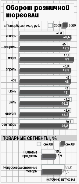 В сентябре оборот розничной торговли в Петербурге составил 46,2 млрд руб., на 17% меньше, чем в сентябре 2008 г., и на 0,1% больше, чем в августе этого года, говорится в отчете Петростата. Торговля непродовольственными товарами в сентябре по отношению к августу выросла на 1%, тогда как продовольственная розница сократила объемы на 3%, свидетельствуют данные статистики.