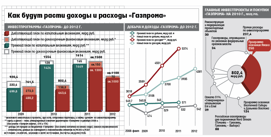 Почти 1,5 трлн руб. инвестиций – расчет «производственников» «Газпрома» исходя из графика ввода главных проектов, объясняет сотрудник компании. Это стройки гигантских газопроводов, которые должны к 2011 г. связать месторождения компании с Nord Stream, ветка Сахалин – Хабаровск – Владивосток (тоже должна быть сдана по поручению премьера Владимира Путина в конце 2011 г.). А в III квартале 2012 г. должна начаться добыча на огромном Бованенковском месторождении на Ямале. Только на работы на полуострове «Газпром» с этого года тратит более 200 млрд руб. в год. Примерно то же объяснение и у представителя «Газпрома»: в прогнозе инвестпрограммы учтены все приоритетные проекты.