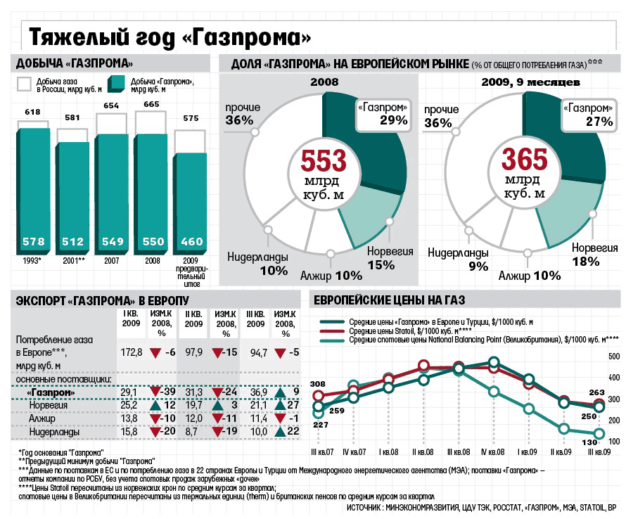 В итоге «Газпром» получил свой индивидуальный кризис: 19-дневный конфликт с Украиной в январе, обвал экспорта в I квартале (на фоне холодной зимы в Европе и самых высоких цен в этом году) и минимальную за всю историю добычу газа по итогам года (см. рисунок и www.vedomosti.ru).