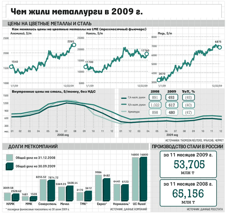 Но главное – реструктурировать долги и поменять условия кредитов смогли все крупные компании: «Мечел», Evraz Group, «Северсталь», «Металлоинвест», UC Rusal и проч. Не обошлось без помощи государства. Evraz Group и UC Rusal еще в конце 2008 г. рефинансировали краткосрочный долг западных банков в ВЭБе, получив $1,8 млрд и $4,5 млрд соответственно. Правда, недавно Дерипаска заверил, что не просил помощи государства. «Я же только помогаю государственным организациям и ничего у них не прошу», – сказал он в интервью испанской El Pais.