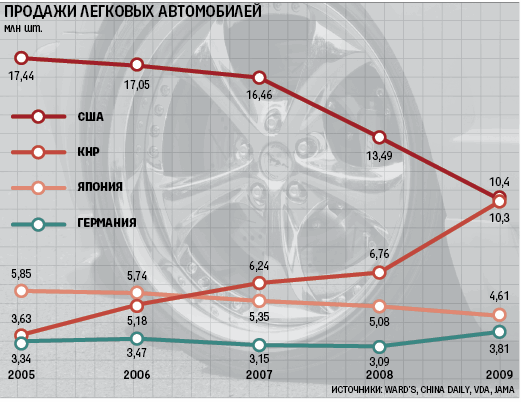 США чуть было не потеряли первое место и по числу проданных легковых автомобилей, завершив год 21%-ным падением рынка. В Китае же, по данным СААМ, рост составил 53% – до 10,3 млн машин. Помогли подъем китайской экономики (ВВП вырос на 9%) и меры правительства. Налог на продажу новых автомобилей в 2009 г. был снижен с 10% до 5%, а на программу утилизации старых машин потрачено 5 млрд юаней ($732 млн).