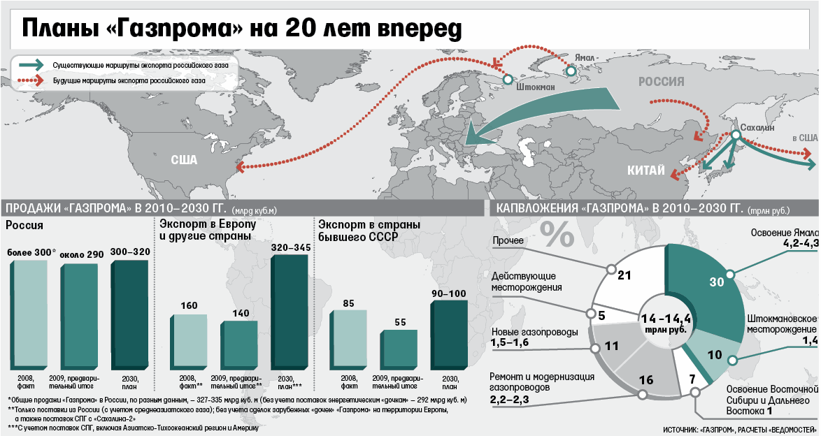 Основную ставку «Газпром» делает на дальнее зарубежье. Поставки в Европу, Азию и США должны удвоиться – до 320–345 млрд куб. м к 2030 г. Таким образом, Россия перестанет быть крупнейшим рынком сбыта для «Газпрома».