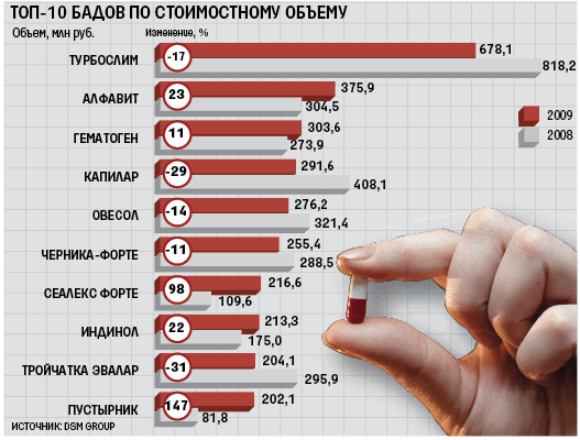 Директор DSM Group Сергей Шуляк оценивает рынок БАДов в 2009 г. в 18 млрд руб. (в том числе аптечные продажи – 12,1 млрд руб.). Среди наиболее популярных в России БАДов – «Турбослим» (аптечные продажи в 2009 г. – 678 млн руб.), «Алфавит» (375,9 млн руб.), гематоген (303,6 млн), «Капилар» (291,6) и «Овесол» (276,2 млн).