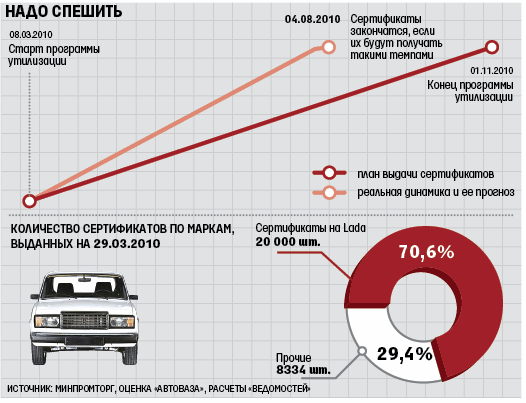 По данным Минпромторга на 19.30 понедельника, с 8 марта было выдано 28 234 утилизационных сертификата из 200 000, которые предполагается выдать до 1 ноября этого года. Безусловным лидером является «АвтоВАЗ»: около 70%, или 20 000 сертификатов, было выдано на покупку Lada, говорит представитель министерства.