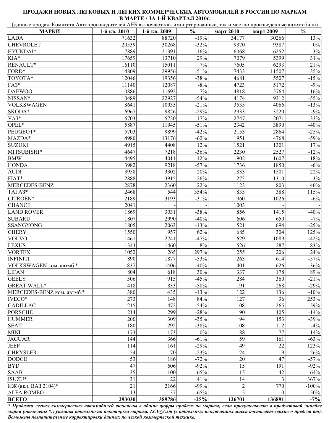Продажи новых легковых и легких коммерческий автомобилей в России за I квартал 2010 г. снизились по сравнению с соответствующим периодом прошлого года на 25% до 293 030 единиц, сообщил комитет автопроизводителей Ассоциации европейского бизнеса (АЕБ). По итогам марта восстановления рынка не произошло: продажи в этом месяце оказались на 7% ниже (126 701 автомобиль), чем в марте 2009 г.