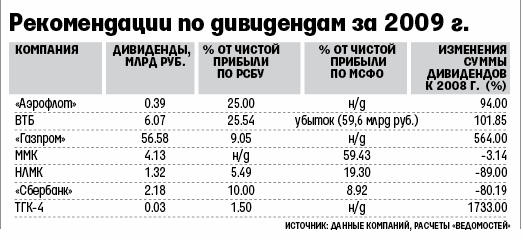Наказ для госкомпаний от чиновников – отдать акционерам четверть прибыли за 2009 г. – пока готовятся выполнить только «Аэрофлот» и ВТБ. Остальные, в том числе «Газпром», рассчитывают сэкономитьВыполнить поручение Шувалова пока готовятся немногие. В их числе «Аэрофлот»: за 2009 г. он может выплатить почти 388 млн руб., или 25% прибыли по РСБУ. Такую рекомендацию рассмотрит сегодня совет директоров компании, говорят два близких к ней источника. Четверть прибыли пообещал акционерам и ВТБ (Сбербанк, как и год назад, собирается выплатить не более 10%).
