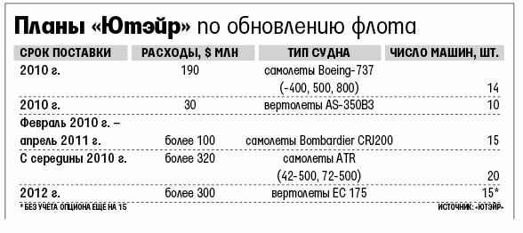 Самая дорогая сделка в планах перевозчика – по 20 турбовинтовым лайнерам ATR стоимостью свыше $320 млн (поставки с середины 2010 г.). На втором месте – контракт на семитонные вертолеты Eurocopter (ЕС175) стоимостью больше $300 млн. В 2012 г. «Ютэйр» готовится получить 15 таких машин (есть опцион еще на 15) для работ на нефтяных и газовых платформах, а также VIP-перевозок. Ведь вертолеты всегда приносили серьезный доход тюменской авиакомпании.