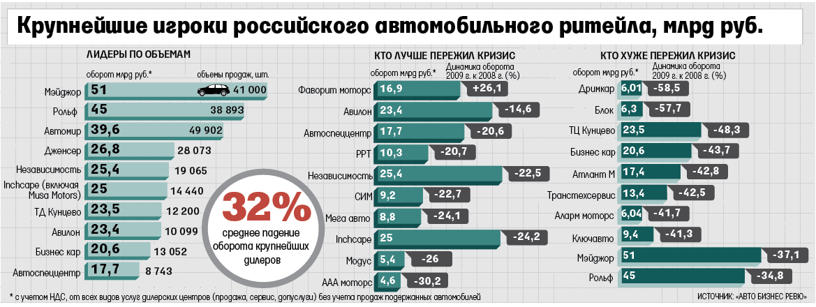 Совокупный оборот 25 крупнейших дилеров страны в прошлом году составил 435,5 млрд руб., это на 32% меньше, чем в 2008 г., свидетельствуют данные ежегодного рэнкинга «Авто бизнес ревю». При этом российский рынок авторитейла в целом (без учета подержанных автомобилей) уменьшился в 2009 г., по данным PricewaterhouseCoopers, на 44% до 845 млрд руб. Получается, за кризисный год дилеры увеличили свою долю на рынке с 42% до 51,5%.