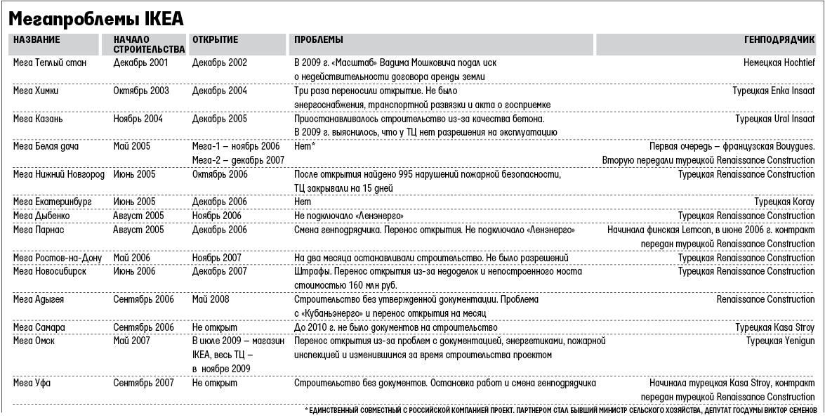 Проблемы везде примерно одинаковые. Например, в сентябре 2006 г. на два месяца было приостановлено строительство «Меги Ростов-на-Дону», которое велось без разрешения и утвержденного проекта. За 12 дней до запланированного открытия «Меги Адыгея» в мае 2008 г. суд оштрафовал «ИКЕА Мос» за строительство без утвержденного проекта, открытие перенесли на месяц. «Мега Уфа», которую начали строить в сентябре 2007 г., до сих пор не открыта; в мае 2008 г. Госстройнадзор Башкирии обнаружил, что часть работ выполнена без надлежащих разрешений. В Новосибирске, когда подошло время открытия «Меги», Госархстройнадзор нашел массу недоделок; по словам руководителя инспекции Госархстройнадзора по Новосибирской области Виталия Ивлева, отсутствовала система теплоснабжения, IKEA пыталась подключить торговый центр к резервным дизельным генераторам и не построила транспортную развязку, хотя это было включено в технические условия; в итоге в день официального открытия «Меги Новосибирск» была введена только треть комплекса, а остальное – через год.