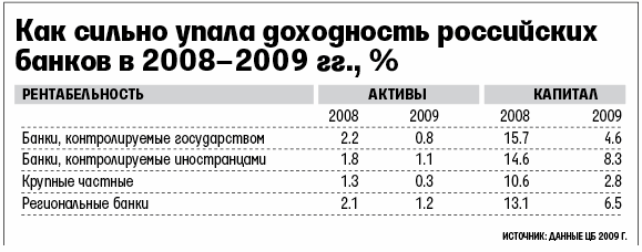 Сильнее всех пострадали показатели крупных частных банков: рентабельность активов и капитала в 2009 г. у них снизилась вчетверо – до 0,3 и 2,8% соответственно. ЦБ учитывает данные российской отчетности, по международным стандартам (МСФО) показатели частных банков выглядят еще хуже, говорит старший кредитный специалист агентства Moody’s Ярослав Совгира.