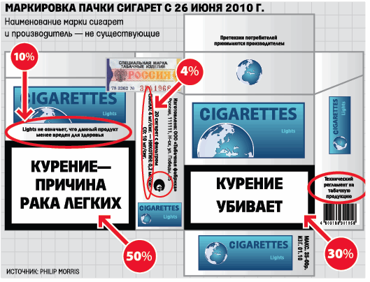 Основные изменения касаются вида пачки сигарет. До сих пор на ней надпись «Минздравсоцразвития России предупреждает: курение вредит вашему здоровью» занимала 4% площади лицевой стороны упаковки и аналогичную площадь на оборотной. С 26 июня 30% лицевой стороны пачки должна занимать надпись черными буквами в рамке черного цвета «Курение убивает». Еще не менее 50% площади обратной стороны упаковки должна занимать одна из 12 утвержденных Минздравсоцразвития надписей о последствиях курения. Например, «Курение может вызывать бесплодие»; «Курение может стать причиной медленной и болезненной смерти»; «Курение может являться причиной импотенции».