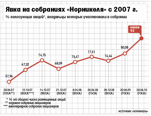 Первая сенсация поджидала участников через час после начала собрания. Сначала было объявлено, что присутствуют владельцы 75% акций. Но при объявлении итогов выяснилось, что явка составила рекордные 92%. Представитель «Норникеля» объяснил разницу в том, что 75% проголосовали до открытия собрания.