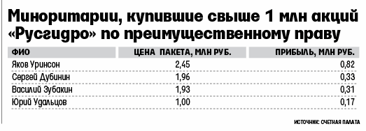 На акциях госкомпаний может экономить только государство, считает Счетная палата. Она припомнила «Русгидро» допэмиссию 2009 г.: бумаги этого выпуска обошлись бывшим членам правления РАО ЕЭС на 4,3 млн руб. дешевле положенного, отмечают аудиторы