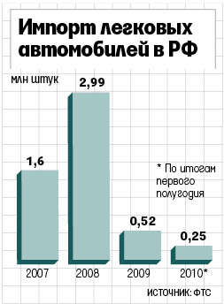 В январе – июне 2010 г. импорт легковых автомобилей снизился на 4,6% до 251 300 штук, сообщила Федеральная таможенная служба (ФТС). По данным агентства «Автостат», падение несколько ниже – импорт иномарок сократился на 3,9%, а новых иномарок – на 4,2%. И это при том, что первое полугодие прошлого года оказалось провальным: из-за кризиса и повышения пошлин на иномарки импорт тогда, по данным ФТС, рухнул на 73,3% до 263 400 штук.