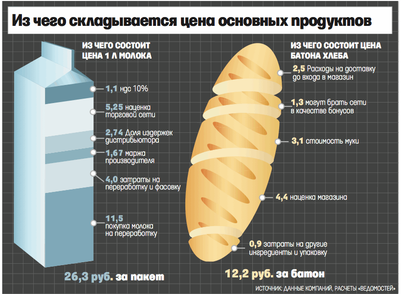 Топ-менеджер крупного производителя молочной продукции сообщил «Ведомостям», как складывается цена на пакетированное молоко. Закупочная цена в 11,5 руб., о которой сказали президенту, не учитывает НДС (10%), объясняет он, с его учетом цена – 12,5 руб. Упаковка и фасовка – 4 руб., почти 2 руб. – маржа производителя, и дистрибутор получает молоко по 18,32 руб. Логистические издержки и высокий процент возврата молока увеличивают цену до 21,06 руб., наценка торговой сети (25%) – до 26,33 руб.
