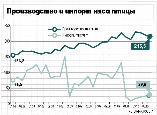 До запрета свою продукцию в Россию поставляли больше 40 предприятий-производителей, напоминает председатель совета директоров ГК «Фуд трейд груп» (один из крупнейших импортеров) Евгений Коган. После открытия рынка американская птица, по его оценке, займет не более 10–15% от общероссийского потребления мяса птицы. В 2009 г. на США пришлось 79% импорта мяса птицы и около 22% всего потребления в России. Американское мясо птицы исторически было примерно на 30% дешевле отечественного, поэтому своего покупателя оно все равно найдет, полагает Коган.
