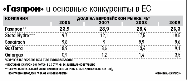 Исходя из данных МЭА, у «Газпрома» выходил не такой серьезный провал: 25% против 26% в 2008 г. А вот 2% рынка ЕС, потерянных в прошлом году, – это почти 11 млрд куб. м газа. Или $3 млрд недополученной выручки по средним ценам «Газпрома» в Европе за 2009 г.