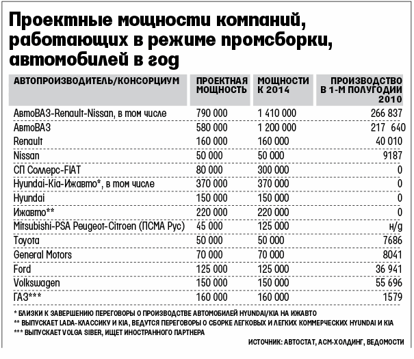 Режим промсборки действует с 2005 г. Он позволил импортировать комплектующие для сборки автомобилей по ставке 0–5% вместо 5–15%. Для этого компании должны выпускать не менее 25 000 автомобилей в год, а через три года после начала действия договора создать производство полного цикла со сваркой и окраской кузовов и постепенно сократить перечень ввозимых компонентов на 30%. Договоры действуют семь лет с начала производства, подписать их можно было до ноября 2007 г., этой возможностью воспользовались 17 компаний (см. таблицу).
