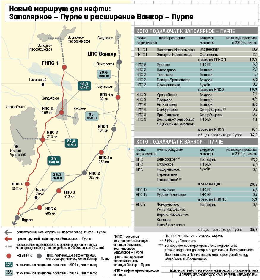 В августе правительственная комиссия по ТЭКу предварительно утвердила программу освоения ЯНАО и севера Красноярского края. В проекте документа были другие параметры трассы Заполярное – Пурпе. Всего их пять. «Предпочтительный» вариант предполагает, что придется вкладываться сразу в две системы: строить новый нефтепровод Заполярное – Пурпе на 488 км и мощностью 34,7 млн т в год, а также расширять нефтепровод «Роснефти» Ванкор – Пурпе. Чтобы тот мог обеспечить прокачку 35,3 млн т нефти в год, нужны четыре новые перекачивающие станции. Кроме того, необходимо построить 969 км подводящих нефтепроводов. Тогда к обеим системам смогут подключиться 24 новых участка, добыча на которых вместе с действующим Ванкорским месторождением достигнет к 2017–2020 гг. 70 млн т в год (см. рисунок). Общие инвестиции в обе стройки – 105,6 млрд руб. с НДС в ценах на конец 2009 г. А с учетом подводящих нефтепроводов – 141,8 млрд руб., говорится в документе.