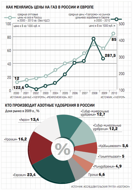 Торговля в России газом по цене, обеспечивающей равную доходность с поставками в Европу, начнется в 2014 г. Но потребители газа беспокоятся уже сейчас. «Планы по либерализации российского рынка природного газа и принцип равнодоходности от контрактных цен на газ в Европе <...> приведет к вымиранию отечественной промышленности азотных удобрений», – написали на прошлой неделе премьер-министру Владимиру Путину руководители 18 предприятий по производству азотных удобрений (копию письма см. на www.vedomosti.ru). Поэтому химики просят установить для производителей азотных удобрений специальную формулу цены. Рассчитывать ее предлагается следующим образом: минимальная контрактная или спотовая цена на газ (либо их комбинация) на рынках Западной Европы (Германия и страны Бенилюкса) минус затраты на транспортировку и экспортную пошлину.