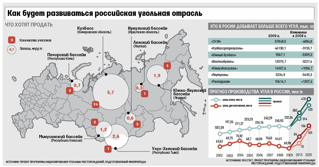 Чтобы это стало возможным, Минприроды предлагает выставить на конкурс до 2015 г. 55 участков с суммарными запасами 11,5 млрд т и прогнозными ресурсами 2,5 млрд т, в основном на Кузбассе – 34 месторождения с запасами 5,65 млрд т. На 2-м месте – Улуг-Хем: семь участков с запасами 2,6 млрд т.