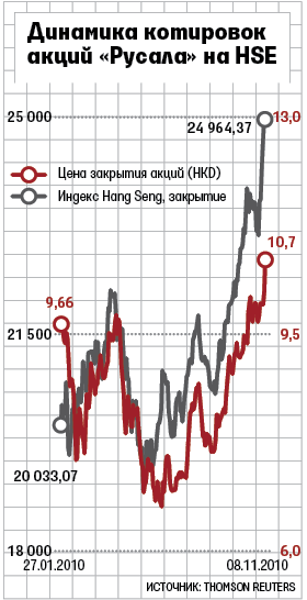В конце января 2010 г. UC Rusal разместила на Гонконгской фондовой бирже 10,64% своих акций, проведя крупнейшее после кризиса и одно из самых удачных IPO среди российских компаний. Обремененную долгом в $14,9 млрд UC Rusal инвесторы тогда оценили в $21 млрд, и компания сумела привлечь $2,24 млрд, продав бумаги по 10,8 гонконгского доллара за акцию. Правда, сразу после размещения котировки UC Rusal начали падать: в первый же день торгов акции подешевели почти на 10,6% (до 9,66 гонконгского доллара), а вся компания – на $2,23 млрд. К середине февраля бумаги концерна стоили уже 7,5 гонконгского доллара, и в середине июня котировки достигли дна: акции стоили всего 6,7 гонконгского доллара. Затем котировки начали медленно расти, но после отметки в 10,1 гонконгского доллара в середина октября началась стагнация. Правда, акционеров такая динамика не огорчала. «Задней мыслью мы все сильны. Но я все равно уверен в этой инвестиции», – говорил в октябрьском интервью «Ведомостям» Натаниэль Ротшильд, чей фонд NR Investments во время IPO вложил $100 млн в акции UC Rusal. По его словам, к началу следующего года бумаги могут вырасти вслед за сommodities.