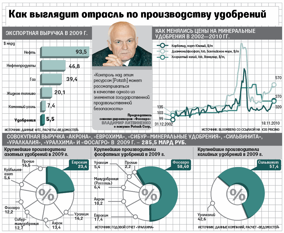 Похоже, «Фосагро» ищет, как расширить свой бизнес, замечает аналитик Rye, Man & Gor Securities Константин Юминов. В отрасли начался этап консолидации. Вот-вот по инициативе Сулеймана Керимова будет создана единая калийная компания на базе «Уралкалия» и «Сильвинита». Некалийную часть отрасли тоже ждет консолидация, считает аналитик «ВТБ капитала» Елена Сахнова: это вопрос выживания, особенно для производителей азотных удобрений, которым непросто будет пережить грядущее повышение внутренних цен на газ до мирового уровня. На минувшей неделе основной владелец «Акрона» Вячеслав Кантор заявил, что уже в 2011 г. его компания может объединиться с кем-то из конкурентов, например с россошанскими «Минудобрениями» или «Уралхимом». Правда, близкий к этому холдингу источник говорит, что в «Уралхим» с такими идеями никто не обращался.