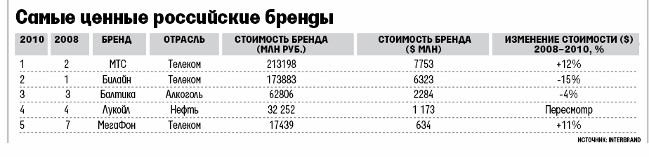 Interbrand зафиксировало и смену лидера: «Билайн», занимавший 1-ю строчку рейтинга первые пять лет его составления, отступил на 2-ю позицию, освободив место своему сопернику — МТС. По оценке Interbrand, с 2008 г. последний подорожал почти на 21% до 213,198 млрд руб. «Билайн» же за тот же период подешевел на 8% до 173,883 млрд руб.