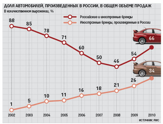 Работающие в России иностранные производители рассчитывают на быстрый рост производства и продаж. В 2010 г. калужский завод Volkswagen должен был собрать 90 000–100 000 автомобилей, в 2011 г. объем производства должен вырасти до 150 000 штук, говорил в сентябре прошлого года предправления автоконцерна Мартин Винтеркорн. Представитель Volkswagen не стал называть актуальные результаты и планы производства на этот год. «ПСМА рус» (завод PSA Peugeot-Citroen и Mitsubishi), выпустивший с момента запуска в апреле прошлого года 26 000 автомобилей, планирует собрать в 2011 г. 46 700 машин, сообщил его представитель. Начавший серийное производство в январе этого года петербургский завод Hyundai за год должен собрать 105 000 автомобилей, в том числе и Kia. Российские продажи Hyundai в 2011 г. должны вырасти на 49% до 130 000 автомобилей, в том числе планируется продать 70 000 собираемых в России Hyundai Solaris, рассказывал «Ведомостям» управляющий директор «Хендэ мотор СНГ» Денис Петрунин.