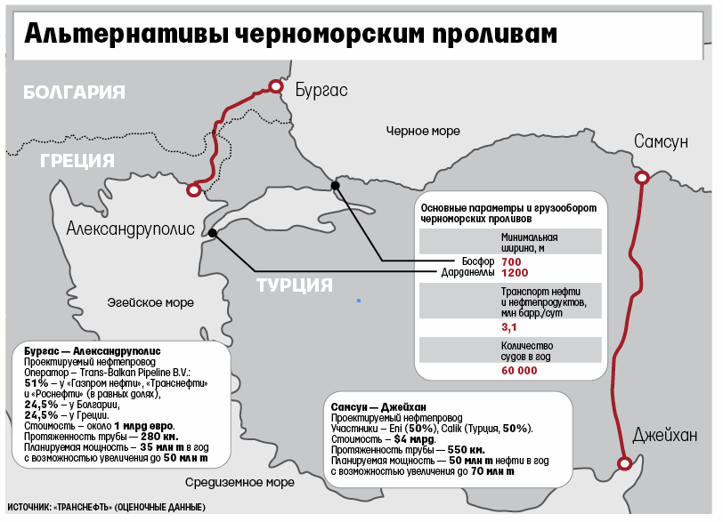 Труба Бургас – Александруполис задумывалась еще в 1990-х гг. как альтернатива танкерным перевозкам через проливы Босфор и Дарданеллы. Но старт проекту был дан только в 2008 г. Стоимость транспортировки нефти по новой трубе составила бы около $7 за 1 т, говорил в прошлом году президент «Транснефти» Николай Токарев. Тогда как доставка танкером через проливы – $4 за 1 т. Трубу планировали запустить уже в 2011 г., но начало строительства то и дело переносилось. Реализации проекта противилось и пришедшее в 2009 г. к власти новое правительство Болгарии. Оно усомнилось в экологической безопасности нефтепровода и фактически прекратило финансирование проекта. В ответ Россия присоединилась к альтернативному проекту Самсун – Джейхан.