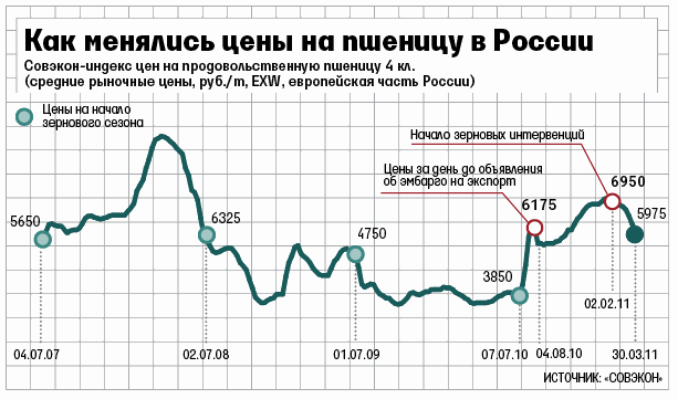 Реакция российского правительства на прошлогоднюю засуху и неурожай оказалась результативной. Эмбарго на экспорт и двухмесячные зерновые интервенции помогли снизить цену на пшеницу до уровня июля прошлого годаСизов считает, что цены упали именно из-за адресного распределения зерна и интервенций. По его мнению, пшеница продолжит дешеветь. С ним соглашается и Рылько. Пока цены для производителей находятся на приемлемом уровне, отмечает президент Российского зернового союза (РЗС) Аркадий Злочевский. Но падение, по его словам, носит обвальный характер. А на юге началась посевная: с учетом себестоимости зерна в текущем сезоне на уровне 4000 руб., излишков на юге (по оценкам РЗС, около 9 млн т) и закрытого экспорта некоторые аграрии могут посеять не зерновые, а масличные. По его мнению, предотвратить обвал и стабилизировать цены может открытие экспорта. Принятые правительством меры показали эффективность, подчеркивает пресс-секретарь премьер-министра Владимира Путина Дмитрий Песков. Вопрос об отмене эмбарго пока не стоит, добавляет он.