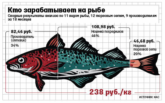 В среднем за 1 кг рыбы покупатель платит в торговых сетях 238 руб., подсчитали чиновники. 34% из этого получают производитель или оптовик, 20% – наценка торговой сети, а 46% – наценка посредников, рассказал автор исследования, начальник управления ЖКХ, строительства и природных ресурсов Рачик Петросян. Самая большая наценка посредников (ФАС называет ее серой зоной) – на наиболее ходовые и недорогие виды рыбы, например сельдь (49,1%), путассу (64,4%), мойву (51,8%) и горбушу (41,2%), говорится в материалах ФАС. «Это не реальные посредники, это посредники в деньгах, а не в товаре. Через эти фирмы проходят деньги, но такого количества посредников никто не знает, никто не понимает, что за реальная работа происходит за эти деньги», – заявил замруководителя ФАС Андрей Цариковский.