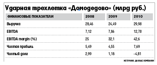 Собственникам аэропорта есть чем привлечь инвесторов. Как рассказали «Ведомостям» два источника, близких к банкам-организаторам, консолидированная выручка «Домодедово» за 2010 г. составила 29,98 млрд руб. (прирост к уровню 2009 г. – 2,6%), EBITDA – 12,78 млрд руб. (+34%), чистая прибыль – 7,69 млрд руб. (+18,4%); рентабельность по EBITDA – почти 43%; при этом чистый долг составляет отрицательную величину 4,8 млрд руб. (подробнее см. таблицу). «Домодедово» достойно смотрится на фоне крупнейших аэропортов Европы: так, рентабельность по EBITDA лондонского аэропорта Heathrow – 47,2%, компании Aeroports de Paris (управляет всеми аэропортами в Париже) – 33,8%, авиационного сегмента компании Fraport (управляет аэропортом во Франкфурте) – 19%. Более 60% всей выручки «Домодедово» приносит вспомогательный бизнес (хэндлинг, продажа топлива, бортовое питание и проч.), оставшиеся 40% почти поровну распределяются между авиационным (сборы на взлет-посадку, за обслуживание пассажиров, авиационную безопасность) и неавиационным (аренда площадей, паркинг, отели и проч.) секторами. Последний – самый рентабельный: более 57% по EBITDA.