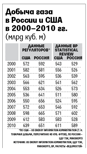 Прошлогодняя добыча Штатов – 611 млрд куб. м газа, отмечает ВР. Производство там растет пять лет подряд. Результат России – 588,9 млрд куб. м. Это 11,6% роста после 12%-ного провала в 2009 г.
