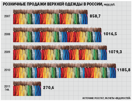 При этом риски в одежном ритейле значительно выше, чем в продуктовом, напоминает Бурмистров. В кризис, например, этот сегмент потребительского рынка заметно просел. В 2009 г. объем российского рынка одежды сократился на 9% – с 1,1 трлн руб. в 2008 г. до 1,03 трлн руб., говорится в отчете «Модного континента» со ссылкой на Росстат и Fashion Consulting Group. «Кроме того, в торговле одеждой больше рисков – неправильно определить целевую аудиторию, ошибиться в подборе коллекции», – добавляет Бурмистров.