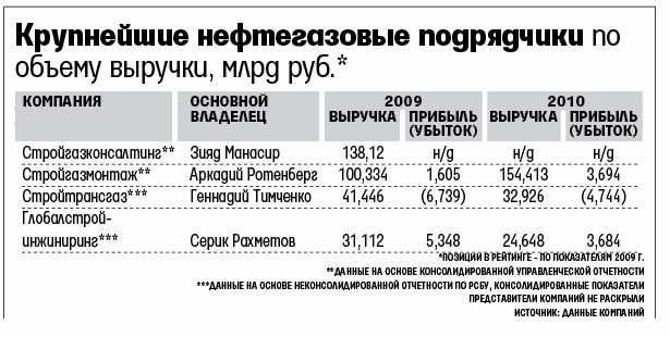 Весной 2008 г. компания «Стройгазмонтаж» получила первый подряд от «Газпрома», уже через год ворвалась в тройку лидеров нефтегазового строительства в России. А в 2010 г. консолидированная выручка «Стройгазмонтажа» превысила 154 млрд руб. без НДС, рассказал «Ведомостям» заместитель гендиректора компании по связям с общественностью Андрей Батурин.