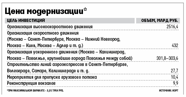 Минимальные инвестиции предполагаются в том случае, если высокоскоростные магистрали (ВСМ), обеспечивающие скорость перевозок до 400 км/ч, будут организованы на участках Москва – Санкт-Петербург и Нижний Новгород – Казань (при этом от Москвы до Нижнего поезда будут ходить по существующей инфраструктуре со скоростью до 200 км/ч, а между Казанью и Екатеринбургом – до 70–90 км/ч). В этом случае из 2,1 трлн руб. общих инвестиций на долю строительства ВСМ будет приходиться 55,2% (1,1 трлн руб.).
