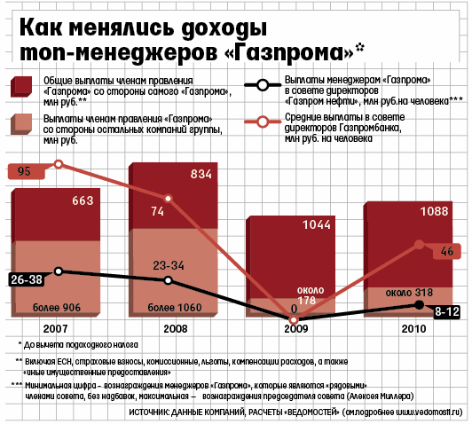 Как раз два года назад – в июне 2009 г. – в «Газпроме» чуть не случился скандал из-за выплат совету директоров «Газпром нефти»: «дочка» готовилась начислить рекордные $17,4 млн, в том числе почти $2,8 млн – председателю совета, руководителю «Газпрома» Алексею Миллеру (расчетный курс не раскрывался). Накануне президент Дмитрий Медведев и премьер Владимир Путин призвали госкомпании сэкономить на бонусах, но «дочек» это формально не касалось (а Газпромбанк не мог заплатить вознаграждения из-за убытка по МСФО).