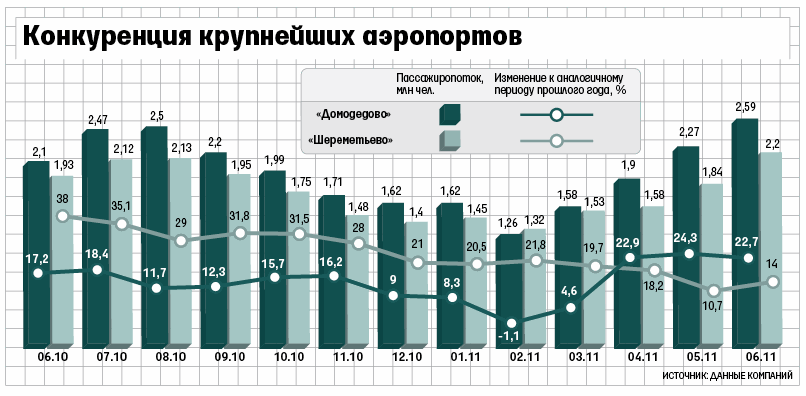 У «Шереметьево» нет задачи обгонять «Домодедово», хотя предпосылки для этого есть, говорит топ-менеджер компании: его прогноз по росту пассажиропотока – 25–30% в год (т. е. до 24,1–25,1 млн человек в 2011 г.). Если прогноз сбудется, то лидер вполне может поменяться. «Домодедово» планирует перевести в 2011 г. 25 млн (+12%), сказал представитель компании.