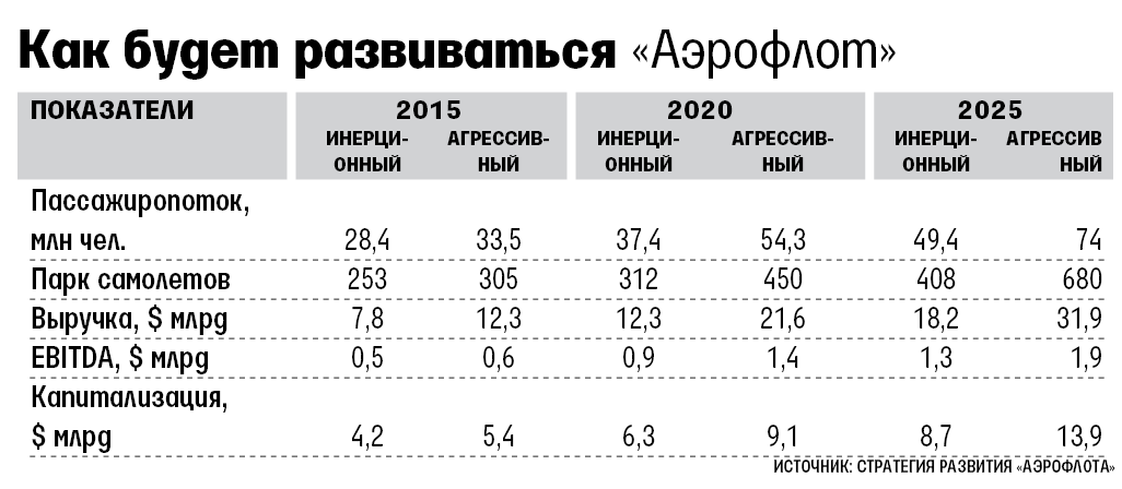 У «Аэрофлота» два сценария развития: при инерционном он остается локальным перевозчиком, при агрессивном есть шанс стать глобальным игрокомСовет директоров «Аэрофлота» утвердил стратегию развития компании до 2025 г., сообщил перевозчик. В ней два сценария развития – инерционный и агрессивный. В первом случае к 2025 г. компания должна будет перевозить 49 млн человек, во втором – 74 млн; выручка перевозчика тоже будет отличаться практически вдвое – $18 млрд против $32 млрд, сказано в презентации «Аэрофлота» (см. таблицу).