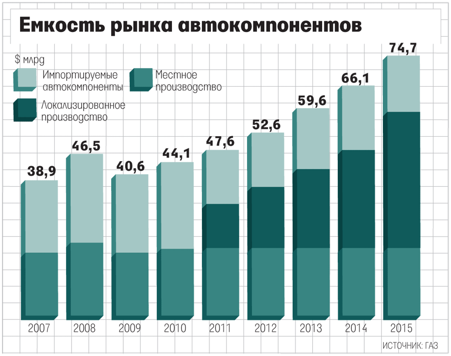 К 2015 г., по расчетам ГАЗа, емкость автокомпонентного рынка России вырастет в 1,7 раза до $74,7 млрд. А выручка группы на этом рынке увеличится почти вдвое к уровню 2011 г., отмечает Эпштейн (прогноз по общей выручке ГАЗ не раскрывает, «консервативная» оценка аналитика «ВТБ капитала» Владимира Беспалова – 194 млрд руб.).