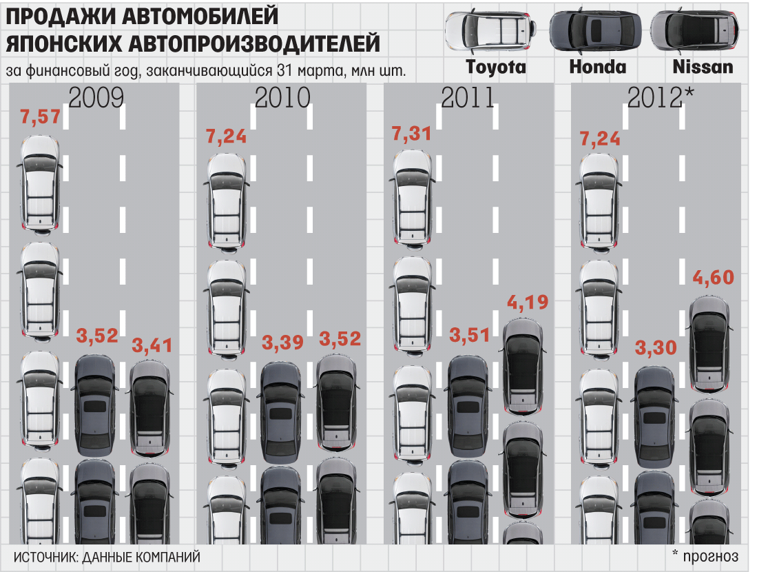 «Восстановление Nissan было относительно более быстрым, чем у ее конкурентов – Toyota и Honda – за счет сильного роста развивающихся рынков», – констатирует директор токийской Mizuno Credit Advisory Тацуя Мицуно. Кроме того, Nissan оказалась подготовлена к кризису. Еще до землетрясения компания в расчете на быстрый рост производства создала запасы электронных компонентов, которые оказались в дефиците после катастрофы, отмечает Bloomberg. Стихийное бедствие ударило не только по автопроизводителям, но и по производителям комплектующих, в первую очередь электроники: так, сразу после землетрясения у Toyota оказались недостаточными запасы 500 компонентов и лишь с постепенным восстановлением производств это число удалось сократить к середине мая до 30, говорил президент компании Акио Тойода. Из-за недостатка производимых в Японии комплектующих минувшей весной останавливались или сокращали производство не только местные заводы, но и предприятия General Motors, Volkswagen, Renault, PSA Peugeot Citroen.