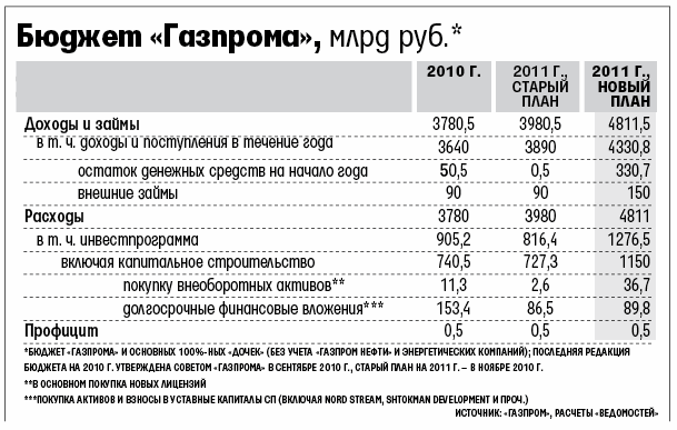 Судя по цифрам «Газпрома», он пересмотрел не только оценку выручки на 2011 г., но и заложил серьезный остаток денежных средств, который получался в начале года (свыше 330 млрд руб.). При первой верстке бюджета не было понятно, сколько денег останется по факту, объясняет сотрудник «Газпрома». Представитель концерна комментировать это не стал. Как и план компании по инвестициям на 2012 г.