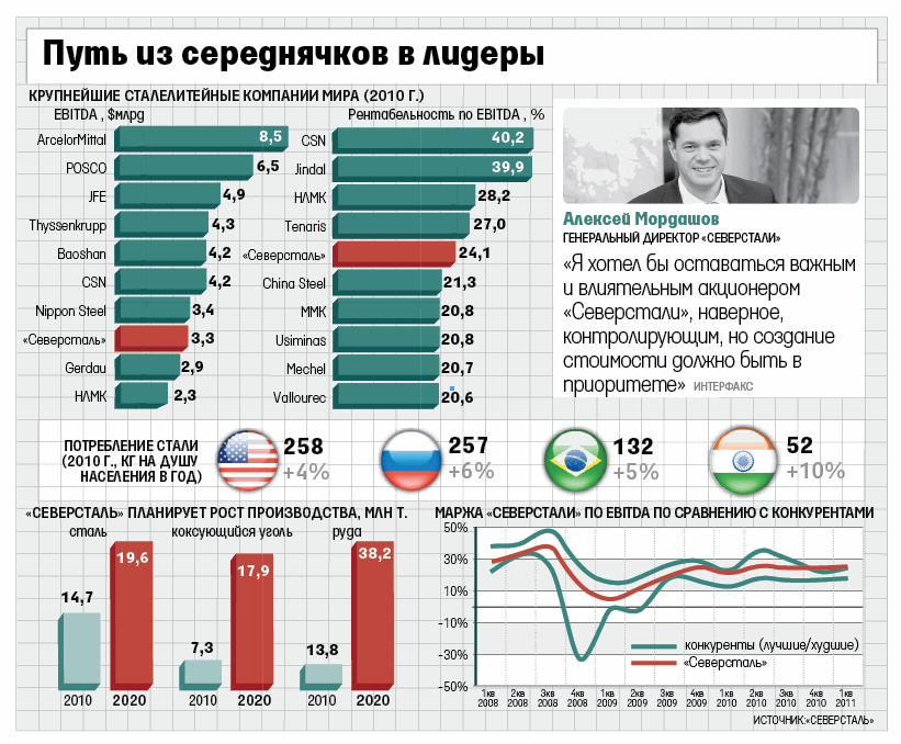 Вчера в Лондоне ключевые менеджеры «Северстали» во главе с гендиректором и владельцем компании Алексеем Мордашовым представили инвесторам новую стратегию компании. С инвестициями в ниобий, алмазы, никель и прочие непрофильные активы покончено. «Северсталь» намерена сконцентрироваться на выплавке стали и добыче сырья для ее производства, заявил Мордашов. Стратегическая цель – превратиться в международную вертикально-интегрированную металлургическую и горнодобывающую компанию и войти в пятерку крупнейших мировых компаний в этом сегменте по EBITDA, говорится в презентации «Северстали». В топ-5 компания намерена войти к 2015 г., уточняет ее представитель.
