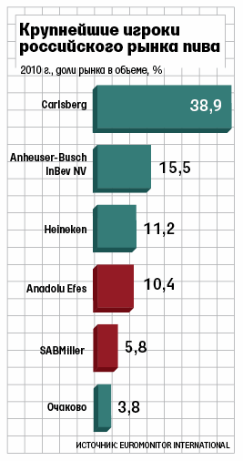 Объединенная компания, по оценкам Euromonitor, сможет потеснить со второй позиции Anheuser-Busch InBev NV, на которую в 2010 г. приходилось 15,5% продаж пива в России. Объем российского рынка в 2010 г. Euromonitor оценивает в 722 млрд руб. и 9,6 млрд л. Российский рынок пива, третий по объему после американского и китайского, может снизиться в этом году на 1–3%, прогнозировал недавно крупнейший продавец пива в России – Carlsberg («мама» «Балтики»).