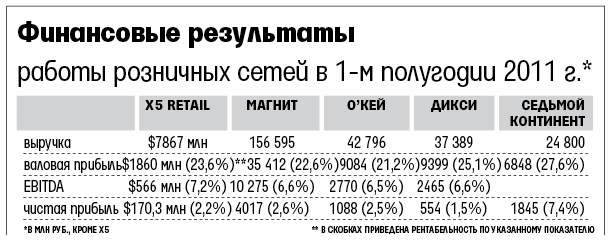 В последние два года «Седьмой континент» был аутсайдером по темпам роста среди крупнейших ритейлеров. Например, выручка сети за 2010 г. увеличилась всего на 3,8% до 46,3 млрд руб. Например, X5 за прошлый год нарастила выручку на 24% (до 341,6 млрд руб.).